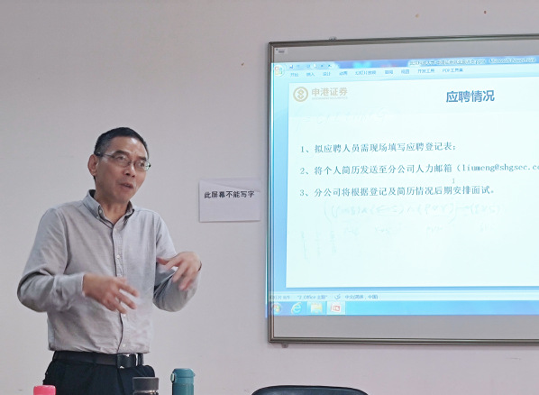 会议邀请申港证券湖北分公司财富管理部总经理李少儒及公司人事部和市场部相关负责人做宣讲。李少儒经理在介绍了证券行业现状的基础上,为参会毕业生讲解证券从业人员所需素养及职业前景,并介绍公司职位需求和相关要求。宣讲会后,同学们积极递交简历并与申港证券工作人员进行沟通交流。